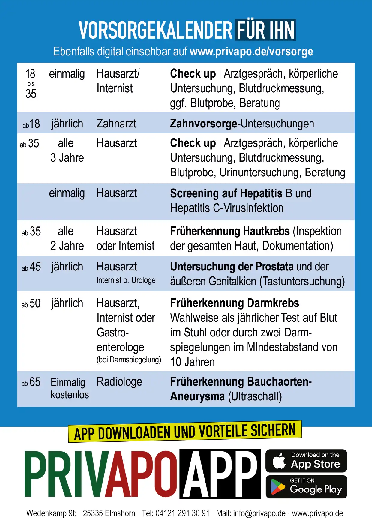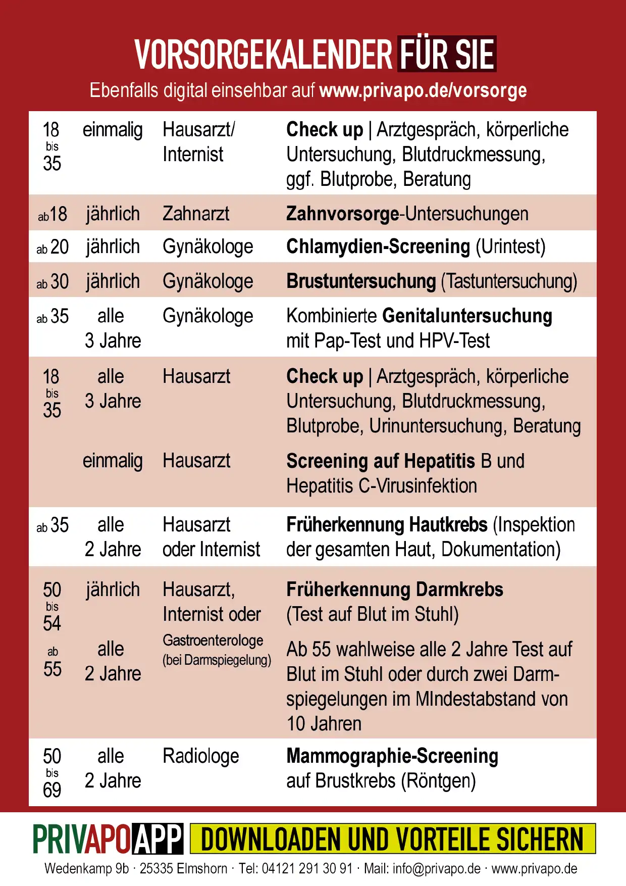 Damit Sie keinen wichtigen Termin verpassen, haben wir für Sie eine übersichtliche Planungshilfe erstellt. Laden Sie sich hier unsere Vorsorge-Übersichtstabelle kostenlos herunter.
